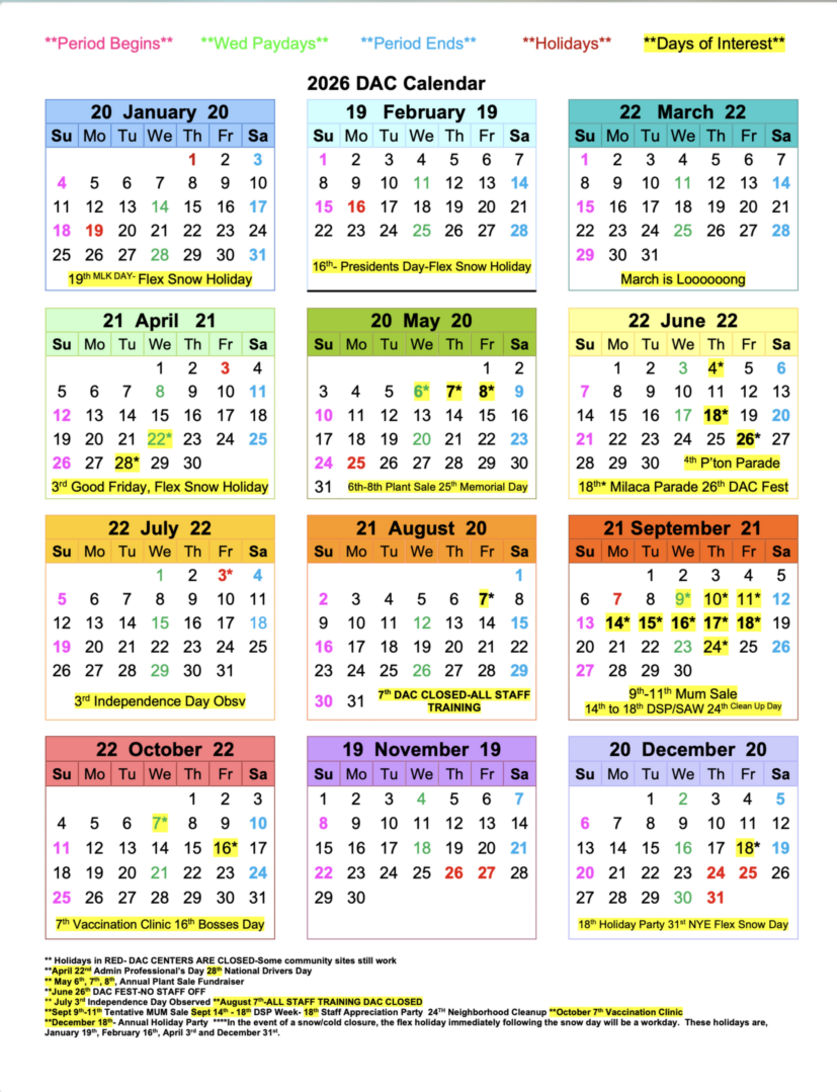 DAC HOLIDAYS and CLOSURES FOR 2026